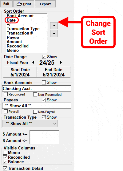 - Sort Order: Transactions may be shown in a specific Order by using the SORT ORDER feature.
